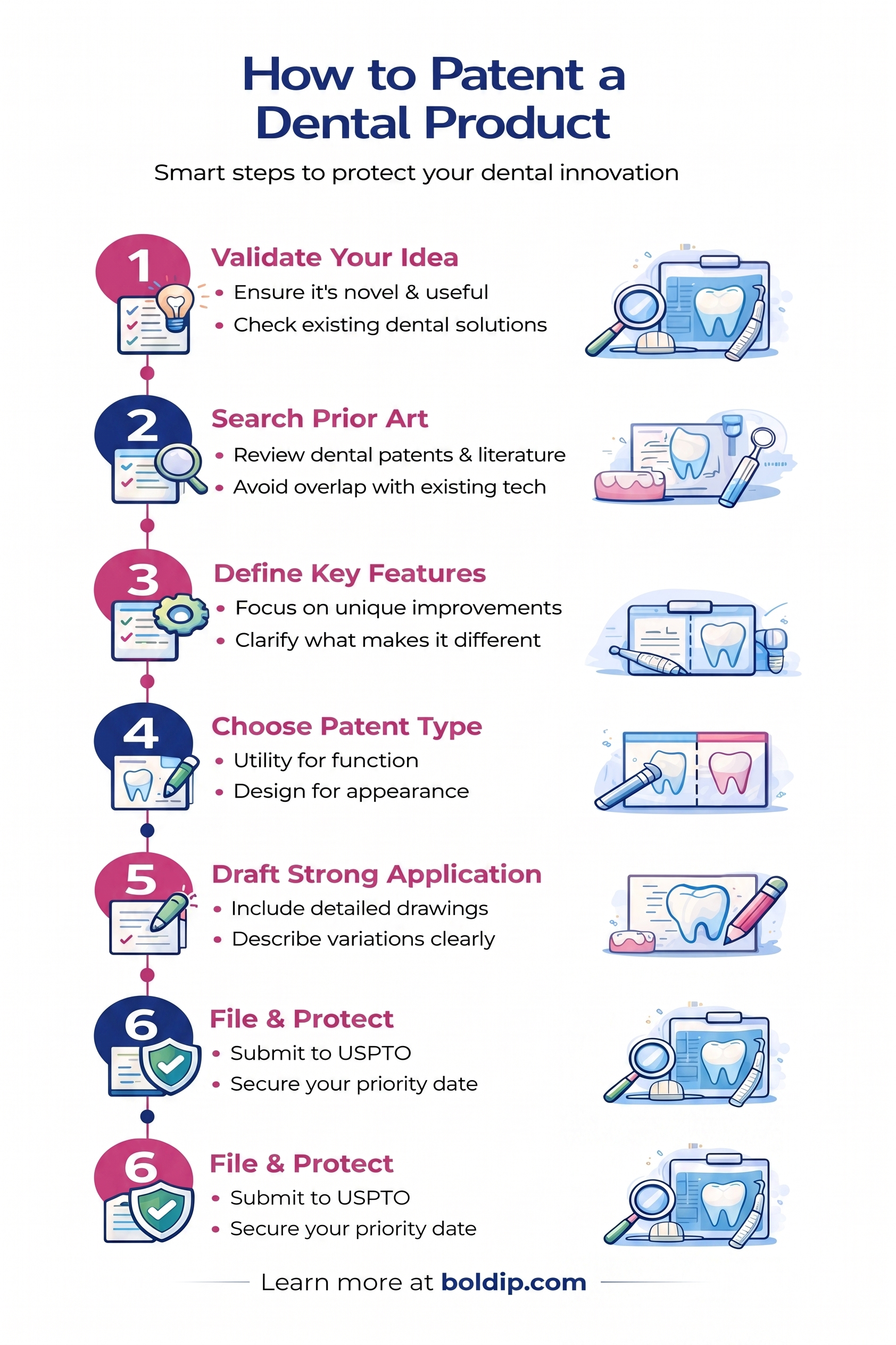 Dental patents are complex; to make sure your intellectual property is protected, you should work with an expert attorney with a wide range of experience. At Bold Patents, we regularly work with inventors of medical devices, and we look forward to guiding you through patenting your dental product. Contact us today for a free Discovery Call.