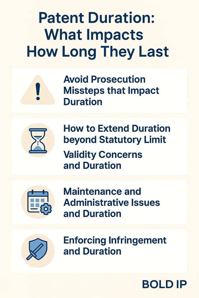 Whether it’s a design, plant or utility patent, during the application phase, every word, form, document uploaded, and communication with the United States Patent and Trademark Office (USPTO) counts. Here are some of the major early-stage/prosecution areas that can affect the duration of your patent rights: