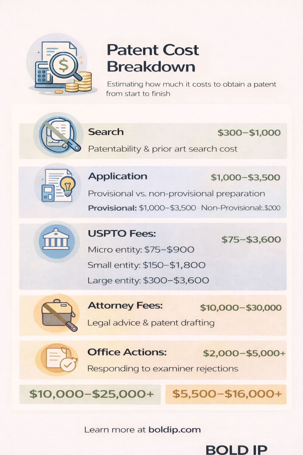 This stage covers drafting and filing your application, responding to USPTO office actions, and negotiating patent approval. The cost varies based on: