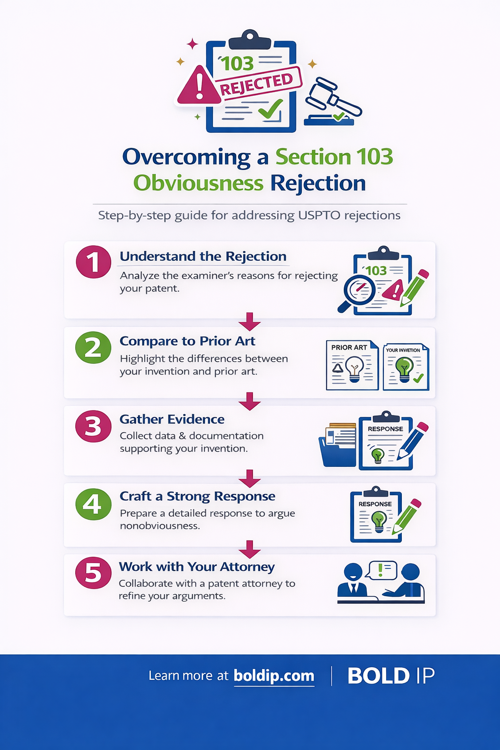 Bold Patents provides a range of services to clients nationwide, including patent searches and patentability assessments designed to help creative minds determine whether their inventions or ideas will meet USPTO non-obviousness standards. We also help aspiring patent holders overcome patent 103 rejection notices as well as other patent actions or rejections on different grounds.