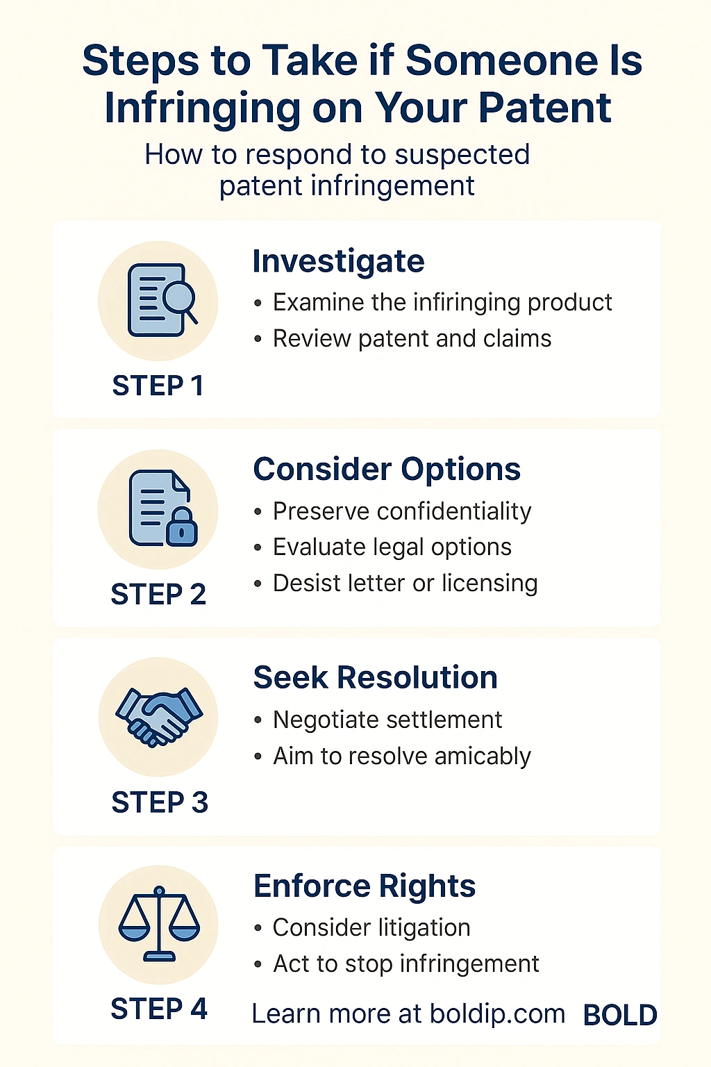 If you suspect patent infringement, it’s critical to act decisively. Start by identifying the potential infringement, consult with a patent lawyer, potentially send a cease and desist letter, and if necessary, file a patent infringement lawsuit. Each step is crucial in effectively protecting your intellectual property rights and preventing further unauthorized use of your invention. At Bold Patents, we’re here to guide you through this process and provide the legal expertise necessary to navigate these complex issues. Don’t hesitate to reach out to us to schedule a free Discovery Call; we are committed to safeguarding your hard-earned innovation.